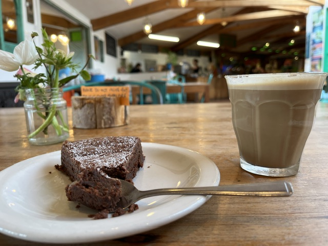 A chocolate almond cake and Flat White at the farm shop Cirencester