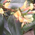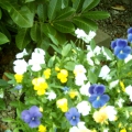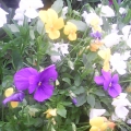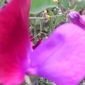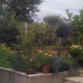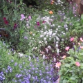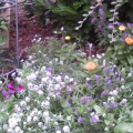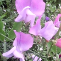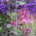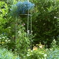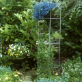 Sweet pea climbing up an obelisk with lobelia hanging basket in the middle. I'm also using obelisks to support gladioli - which would normally have been blown over by the wind here.