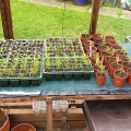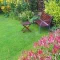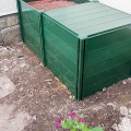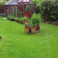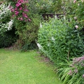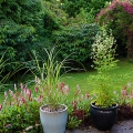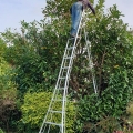 Me trimming a few feet off the Laurel shrub/tree to the right of the Persicaria bed. A tripod ladder is a wise investment if you want to feel safe maintaining high shrubs.