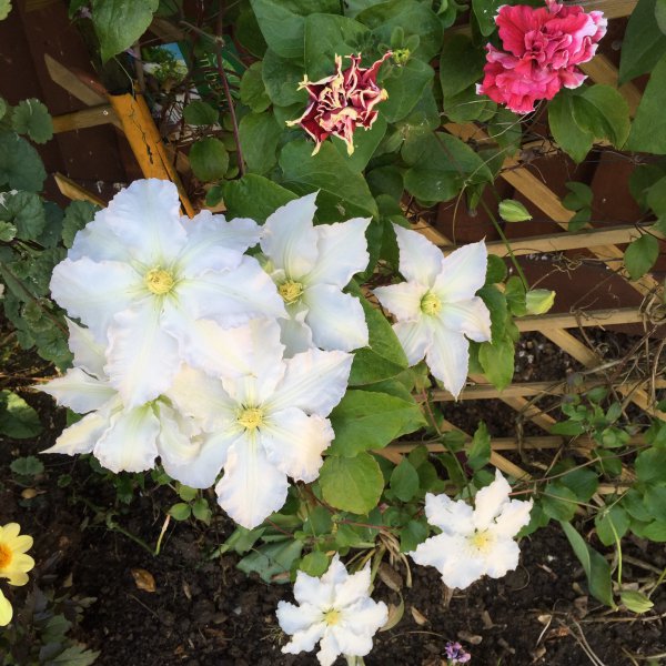 I don't know the names of my clematis at the front :doh:but I have plenty of buds, no blooms as yet, they are quite late this year. I bought two Montanas a few weeks back they bloomed but not for long! They are both growing well :dbgrtmb: