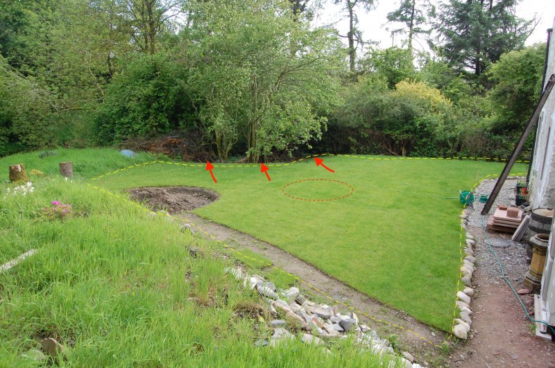 The sandstone has a very slight dish in the middle (shown by the red oval) which creates the softest patch of grass today. Otherwise there's a slope away onto lower ground at the arrows, which begins at the base of the arrows. Otherwise it's pretty flat. It's the area between the arrows and the house that bothers us most. The gravel path by the house doesn't flood, regardless how wet the "lawn" gets, so I'm thinking that, if I raise the lawn a bit, there's no reason for the water to drain towards the house any more than than it does at the moment.