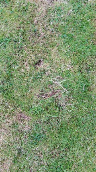 The damage is getting quite bad now and consists of a series of small holes probably 5-9cm wide and about 2 inches (or so deep). There is usually a clump of grass torn off the top and then the animal digs down a short distance into the earth.