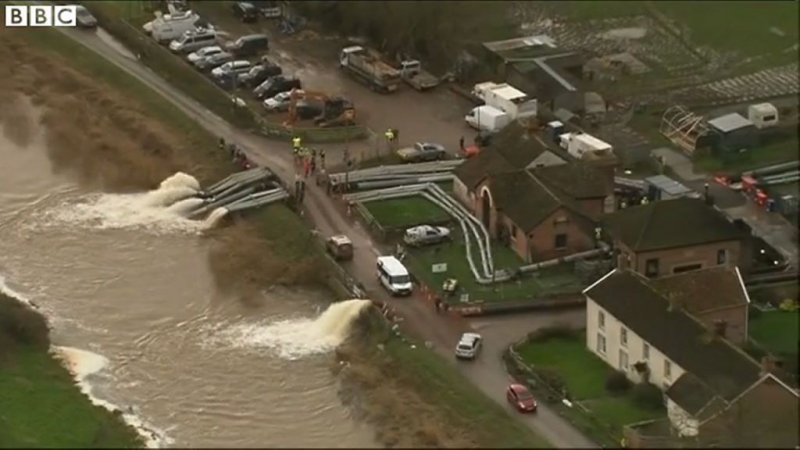 Can someone explain something to me? This screen grab from the BBC video linked above shows pipes that have been bolted together to allow the water to be pumped into the river; earlier in the video, a network of the pipes can be seen surrounding a house - yet at that point they seem to disappear under the road, and conveniently reappear on the other side of the road; what is really odd, is that there appears to be no difference in colour to the road surface at that point, which would suggest that it hasn't been dug up recently.....
