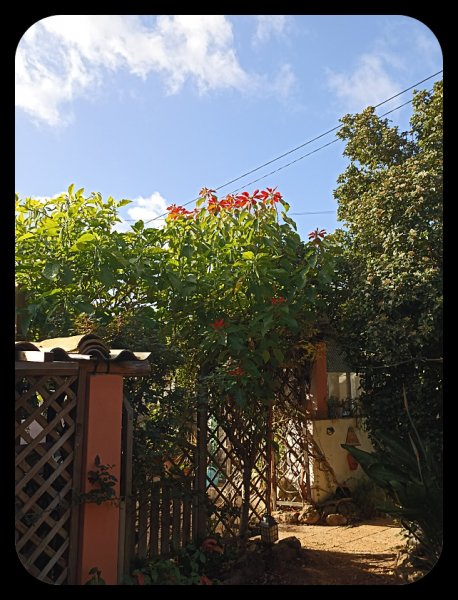 We have short days here too! I think it is more to do with no frost, or virtually none. Mine mostly flowers at the top. During the year it gets shadowed by the Brugmansia, the Honeysuckle/Pandorea over the arch and the outdoor living room so is in the shade often during the Summer heat I see them here (strangely not many. I know of 4/5 others) but they stand proudly alone with nothing near them, are not severely cut back like mine just shaped and bloom all over. I cut mine to get the height. When I planted it, it was alone ... but things grew up around it, as they do.