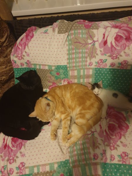 The big ginger one is Henry, the black one Merlin and the baby is herb. They love each other so it's nice to see
