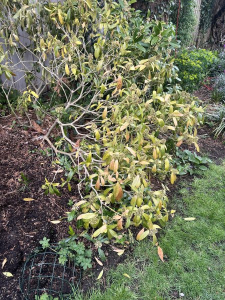 Hi my long-lived and reliable skimmia has suddenly, over only 2 days, almost died - yellowing leaves and it is in a real state. Such a shock to see it. I am wondering if it is drought as we have had no rain for a while down south. If so, will it recover? However what worries me is that it was next to a large well-established euonymus which last year also succumbed very suddenly to scale - almost gone in about four days flat and I had to take it out. I don't think I have any chance of saving this skimmia, but to lose two large shrubs adjacent to one another so quickly is worrying. I am going to have to replant something but should I be checking for some kind of virus, or grub? I attach a photo - it is dying from the exposed side where the old shrub was, towards the still green side ..... Helllllppp!!!