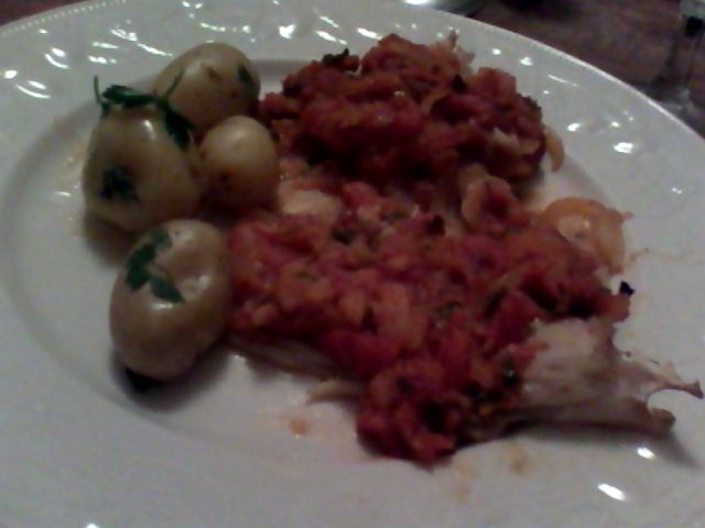This evening, "Raya a la Malaguena" - A Spanish dish from the great piscatoriaphile Alan Davidson. - Wings of skaite baked in a sauce of onion, garlic, tomato, saffron, almonds and fried crumbs served with some potatoes a green salad and a glass of white wine.